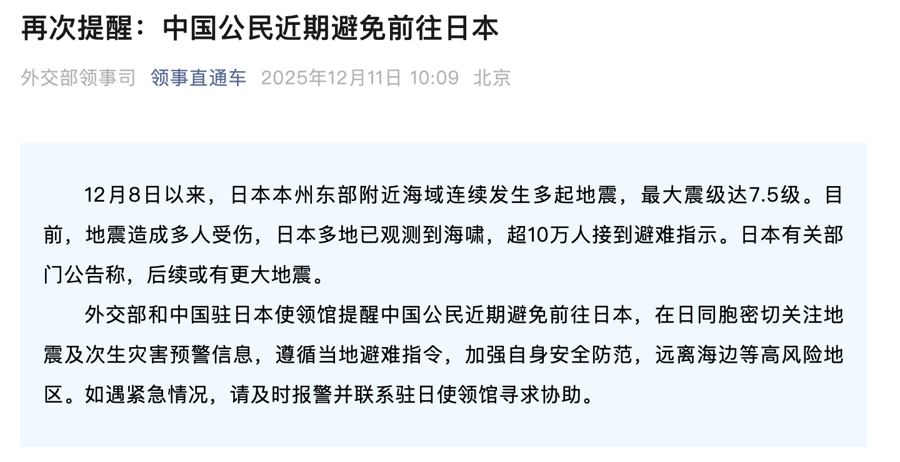 外交部和中国驻日本使领馆提醒中国公民近期避免前往日本,在日同胞密切关注地震及次生灾害预警信息,遵循当地避难指令,加强自身安全防范,远离海边等高风险地区。如遇紧急情况,请及时报警并联系驻日使领馆寻求协助。